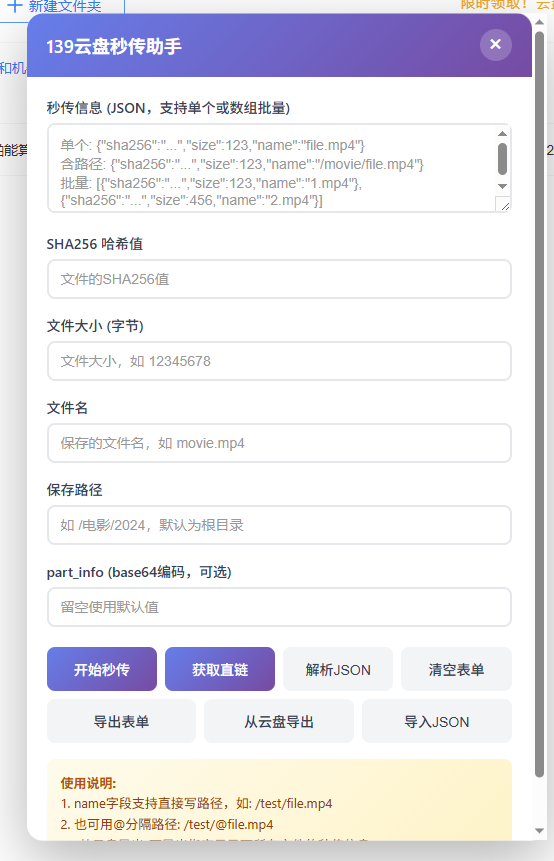 大佬开发的移动秒传插件,直接放油猴里面即可,只负责搬运,具体功能自验
